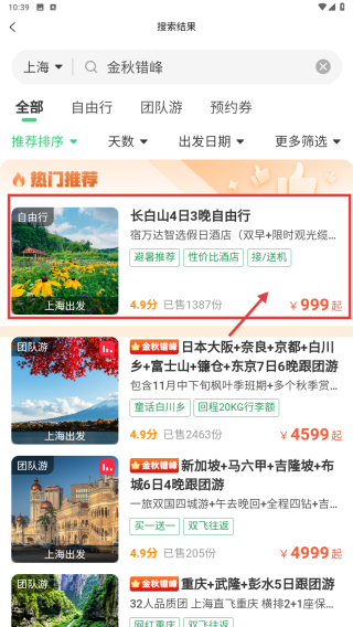3、在产品列表中,找到长白山4日3晚自由行条目¥999起/人,宿万达智选假日酒店,点击进入产品详情页。