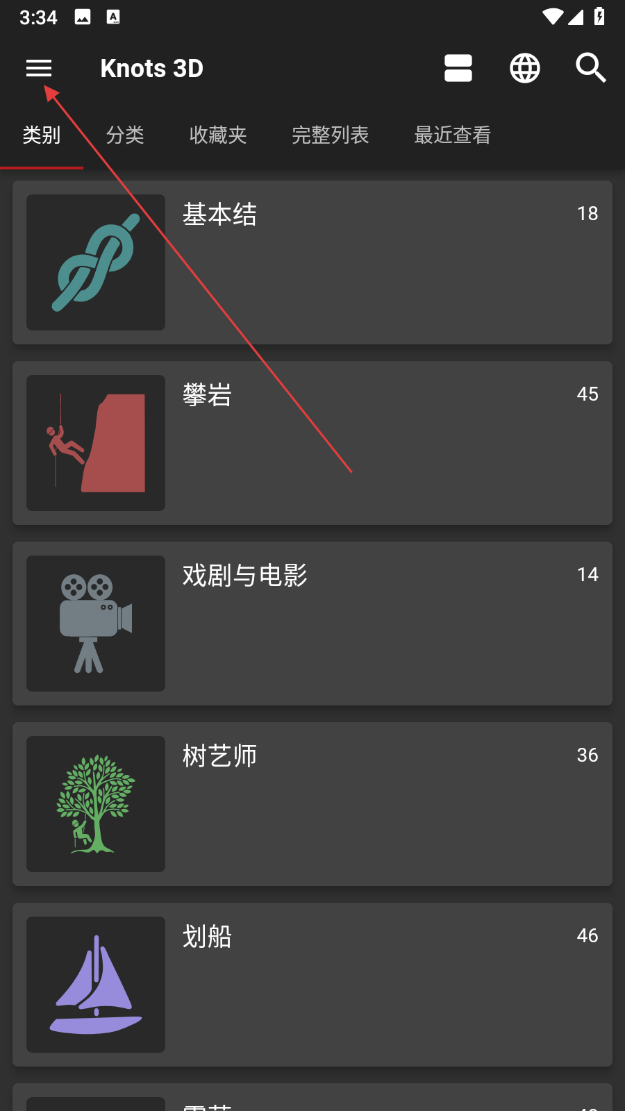 1、打开Knots 3D应用,点击左上角三条横线的菜单图标,等待侧边栏菜单展开。