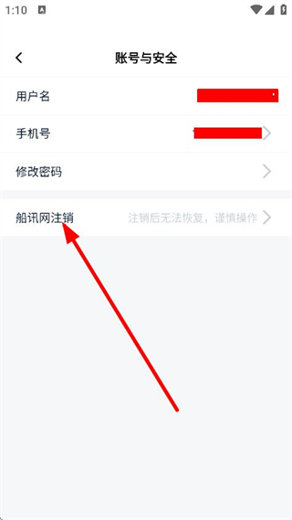 3、在账号与安全页面,点击船讯网注销,进入注销账号流程。