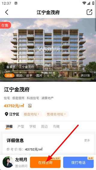 1、在楼盘详情页面,点击在线咨询,进入与置业顾问的聊天页面。