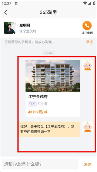 2、在聊天页面,可发送楼盘相关咨询内容,与置业顾问沟通。