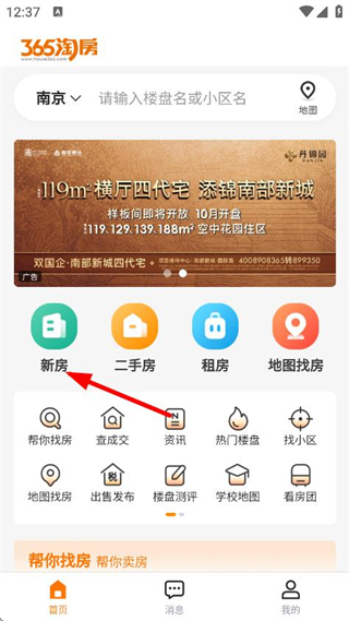 3、随后我们在APP的首页,点击新房,进入新房列表页面。