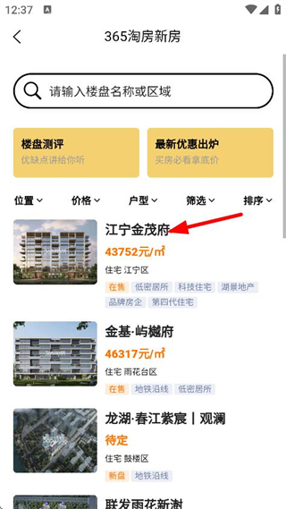 4、在新房列表页面,点击要查看的楼盘,进入该楼盘详情页面。