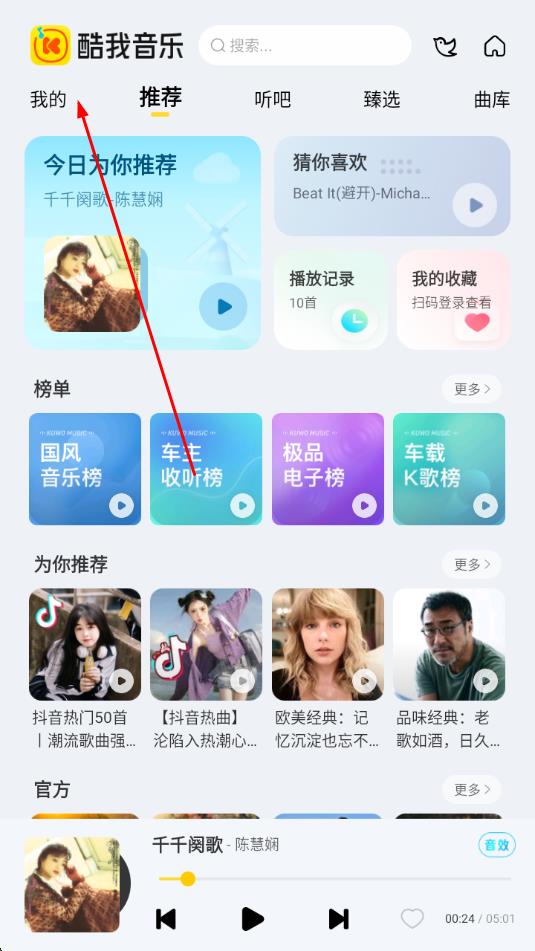 1、推荐:软件在这个功能里面为用户推荐了大量的各种榜单上面的歌曲,包含了抖音热歌版以及酷我飙升榜等;