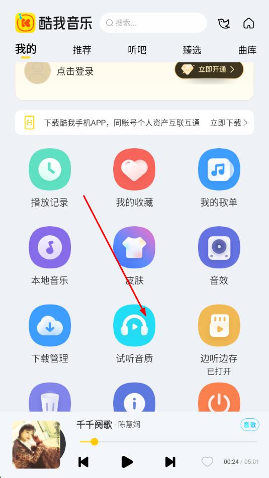 2、在“我的”页面里,找到并点击试听音质图标。