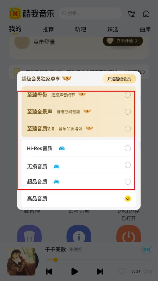 3、在弹出的音质选择窗口中,会显示多种音质选项,根据需求和会员权限,选择音质选项。