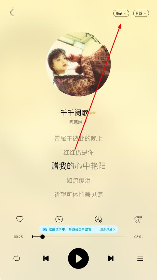 4、设置完成后,播放歌曲时,点击歌曲播放页面右上角的高品按钮,可查看当前音质设置。