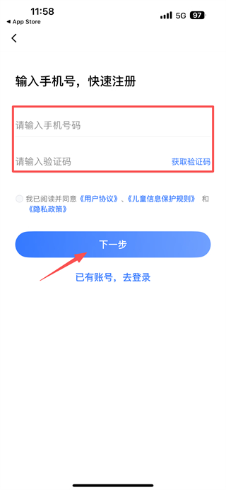 4、在账号注册页面,输入手机号码,获取并输入验证码后点击下一步按钮,完成账号注册操作。