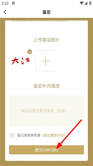 4、勾选我已阅读并同意后,点击提交CNY200,完成鉴定提交。