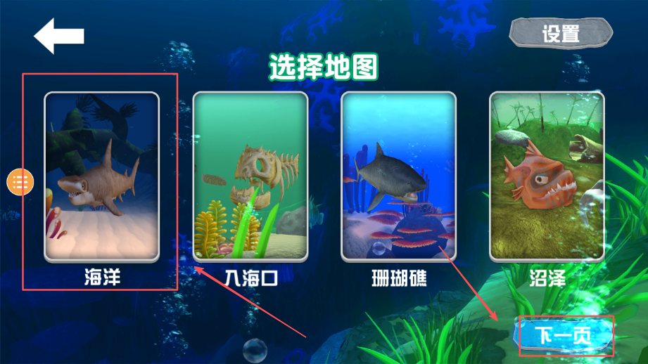 2、点击开始游戏后,会进入地图选择界面,在提供的不同海底地图中挑选一个喜欢的,确定后进入下一个选择步骤。