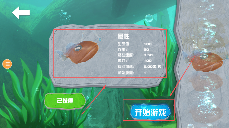 3、选好地图后,界面会展示可使用的鱼类,从中挑选一条心仪的鱼,点击对应的选择按钮,确认后正式开始游戏。