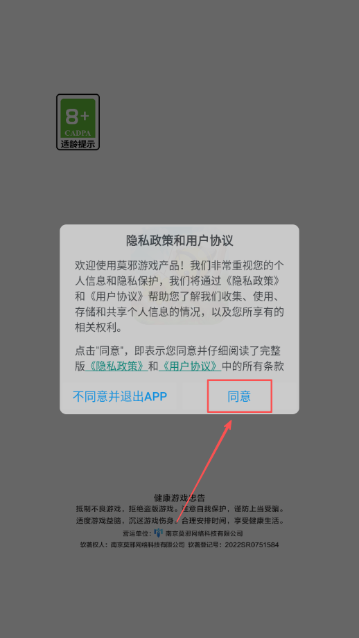 1、进入游戏后,先找到软件协议相关弹窗,认真阅读后点击同意按钮,完成协议确认才能继续后续操作。