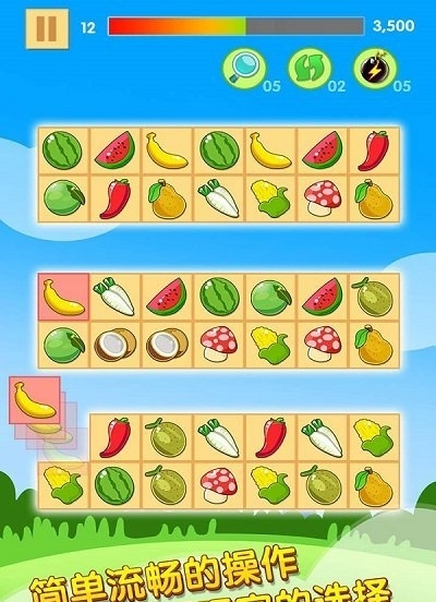2、进入模式后选择对应关卡,关卡加载好后,观察屏幕上的水果和蔬菜,找到两个相同的物品,用手指依次点击这两个物品。