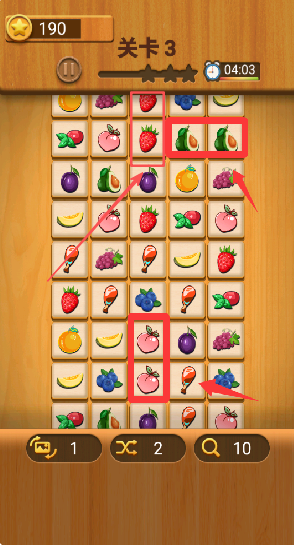 3、点击后若两个相同物品之间能形成有效连线,就会直接消除;遇到困难时,看向红色框框里的道具,必要时点击使用道具。