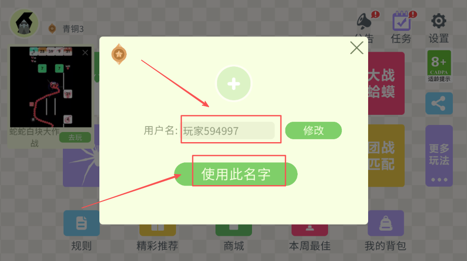 1、刚进入游戏时,先想一个用户名填好,填完后找到 “使用此名字” 的按钮点一下,就能确认身份往下走。