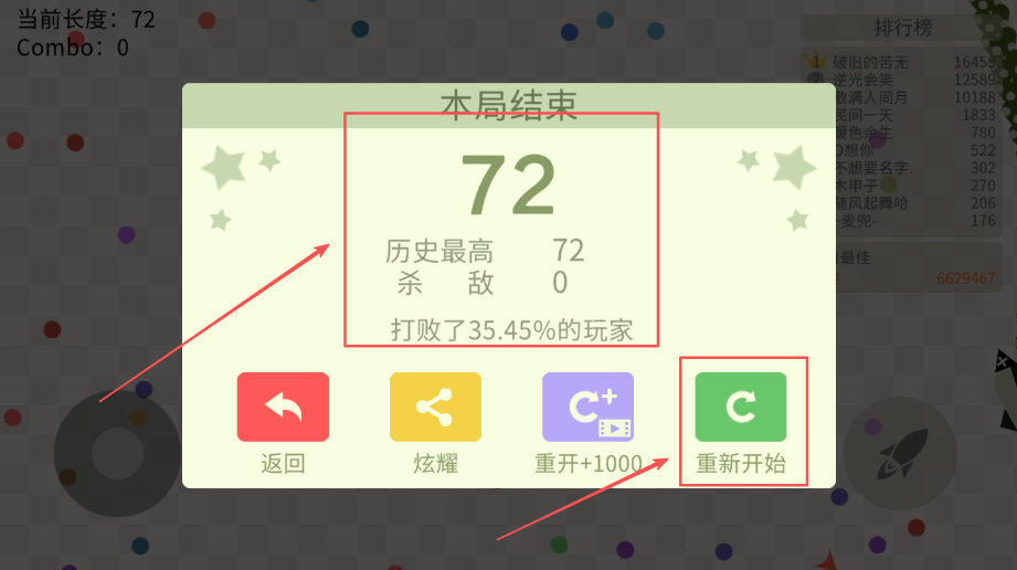 4、一局游戏打完后,屏幕上会显示这次的分数方便查看,要是想再玩一局,找到 “重新开始” 按钮点一下就行。