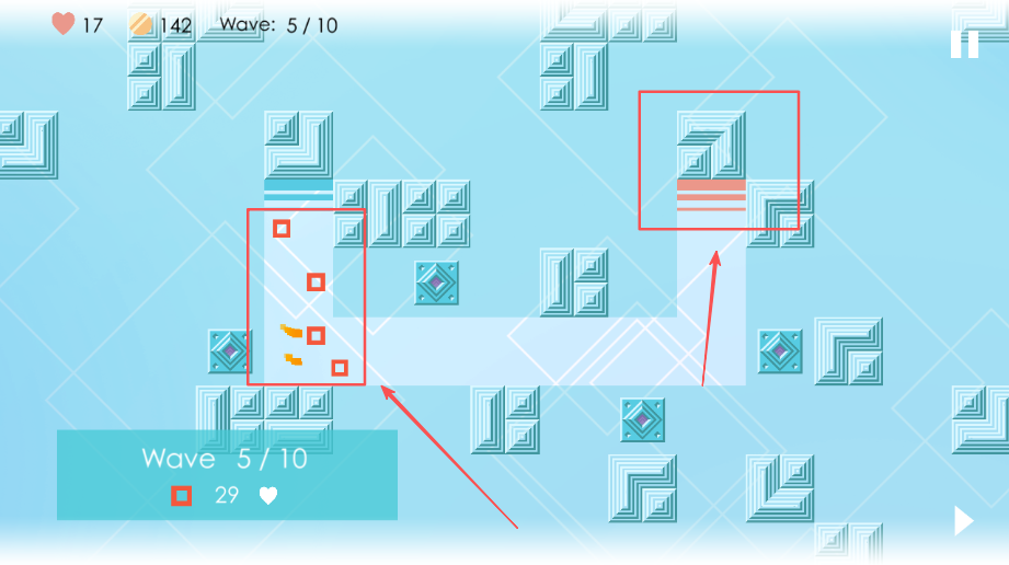 4、选好炮台后,炮台会自动攻击从左侧方块出现的红色小方框,保护右侧的方块不被这些红色小方框攻击。