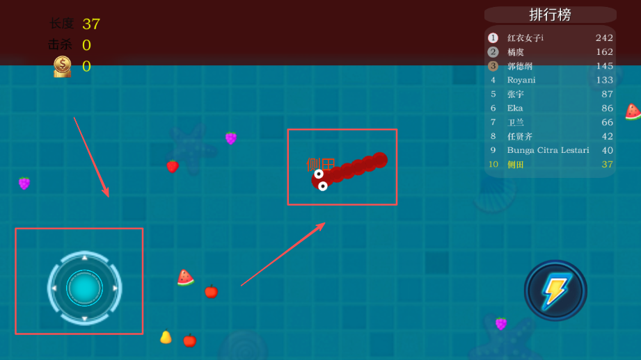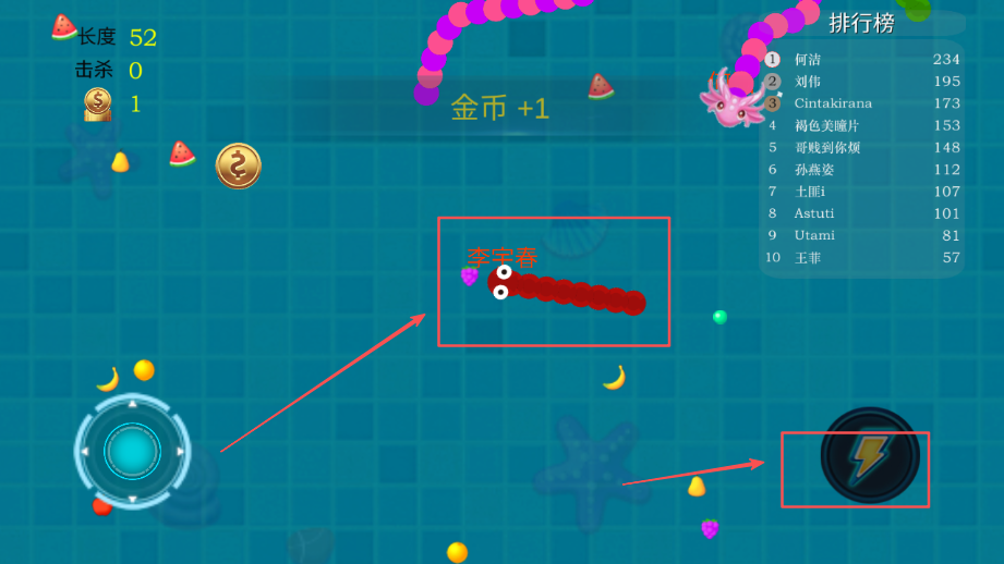 1、核心玩法围绕贪吃蛇的成长与竞技展开,在对战中控制蛇身移动,吃掉场景中的物品让蛇变长,同时避免和其他蛇或边界碰撞。