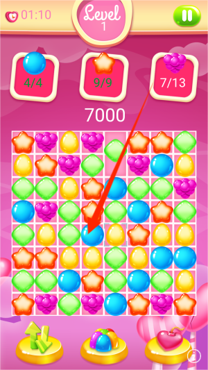 1、进入关卡后,观察棋盘上宝石的分布情况,通过滑动交换相邻两个宝石的位置,使同一行或列出现三个及以上相同图形即可完成一次消除。