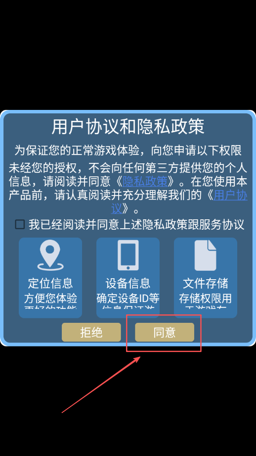 1、打开游戏后会看到游戏协议,得点一下同意,要是不同意的话,就没法继续使用游戏里的各种功能,这一步可不能跳过哦。