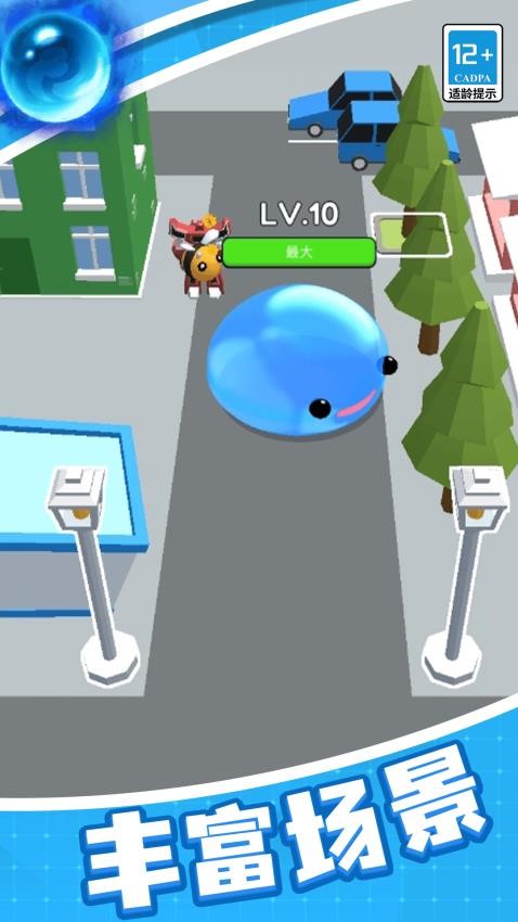 1、街区吞噬成长机制:玩家需操控史莱姆在街道中穿梭,吞噬建筑、物品及弱小生物积累经验,实现从弱小到强大的蜕变。