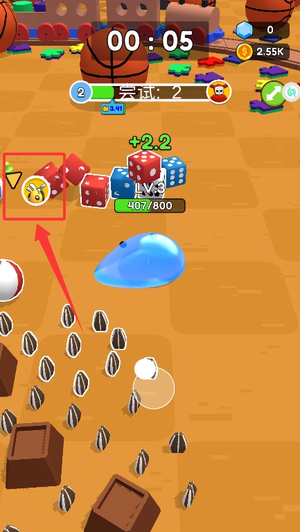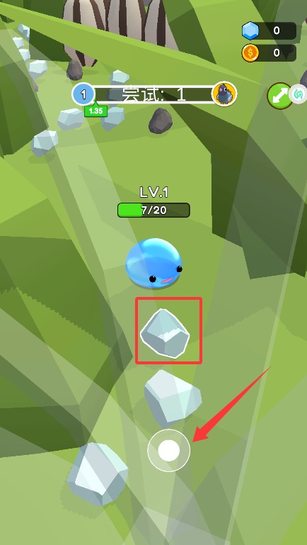 2、通过滑动屏幕控制史莱姆移动方向,吞噬场景中的物品使自身逐渐成长。