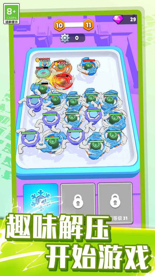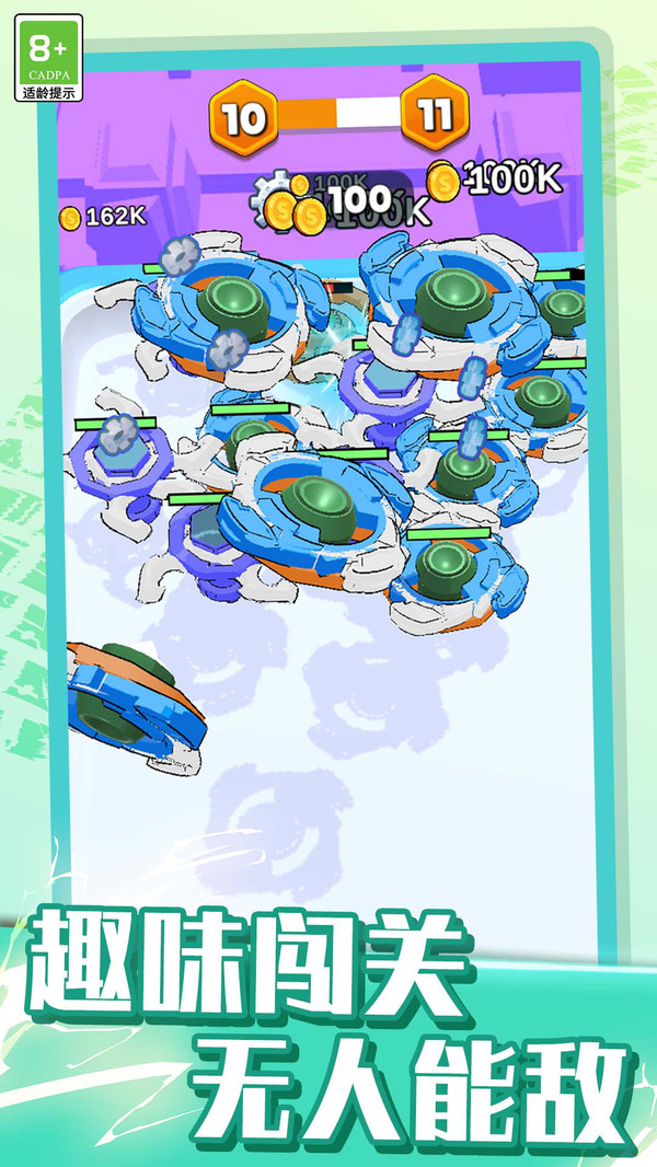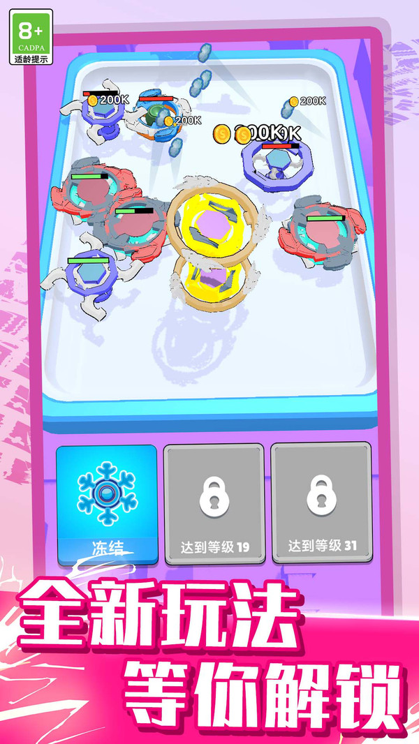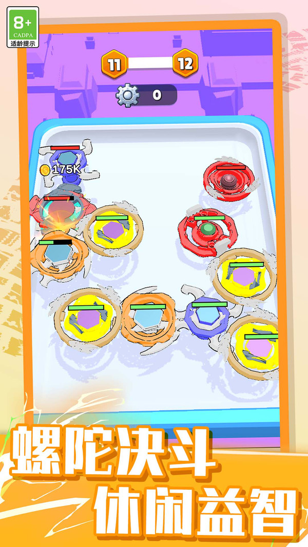 2.精准反应:在陀螺高速旋转的过程中进行操作,反应速度与精准度决定了合成效率,考验玩家的专注力与手眼协调能力。