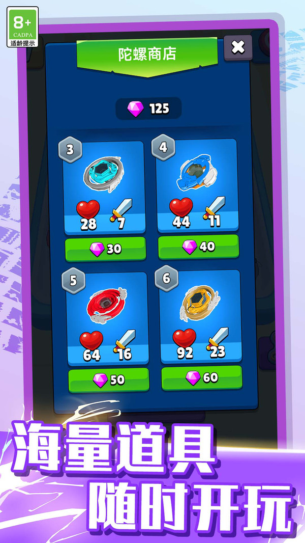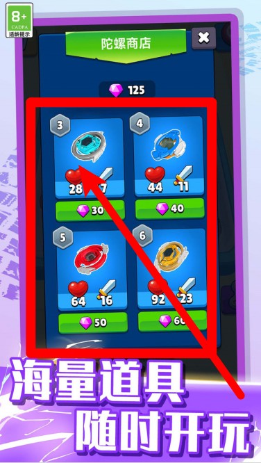 1.道具商店丰富:在陀螺商店中解锁不同等级的陀螺,每个都有独特数值,玩家可用宝石兑换,策略选择决定胜负。
