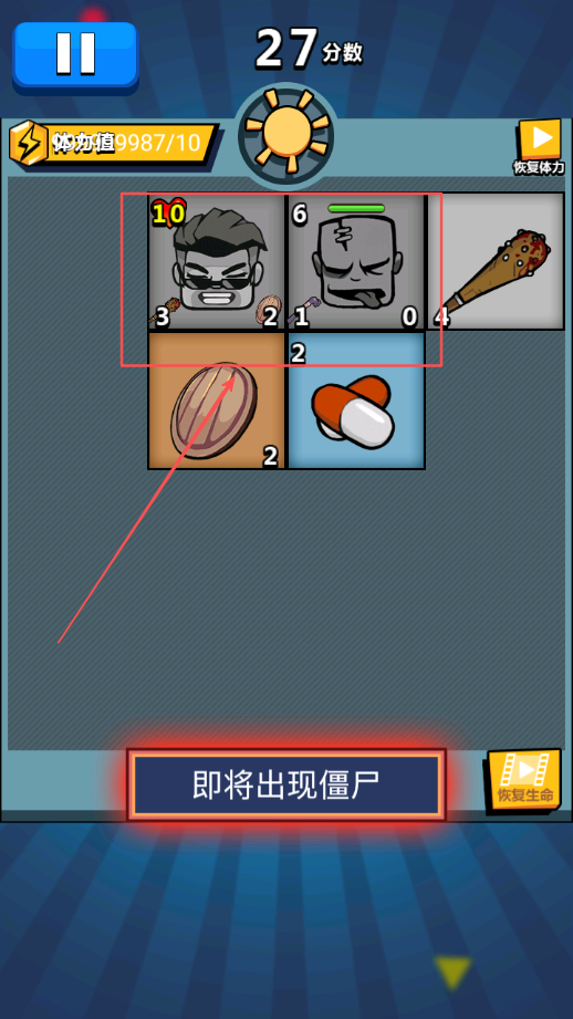 1、打开游戏后先熟悉 2048 的基础玩法,再了解当前关卡僵尸的进攻规律,提前想好应对策略,做好防御准备。