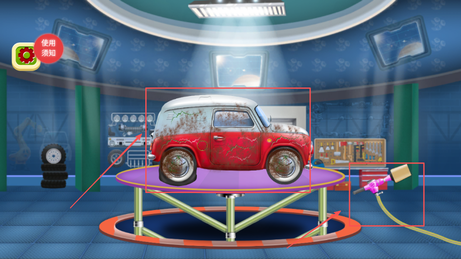 2、进入游戏后,首先要对需要涂画的汽车进行清洁,按照提示操作,把汽车表面的灰尘和污渍都清洗干净。
