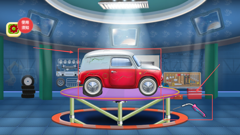 3、汽车清洗完成后,会看到车身可能存在划痕,接下来需要按照游戏指引,把这些划痕都修复好,让车身恢复平整。