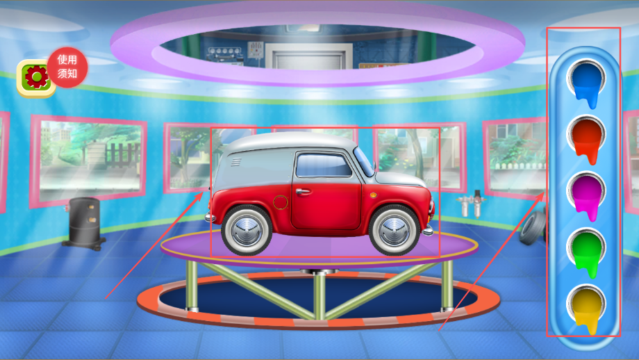 2、用手指按住选中的颜色,在汽车图案的对应区域滑动,比如给车身涂红色、车轮涂黑色,涂的时候可以自由控制范围。