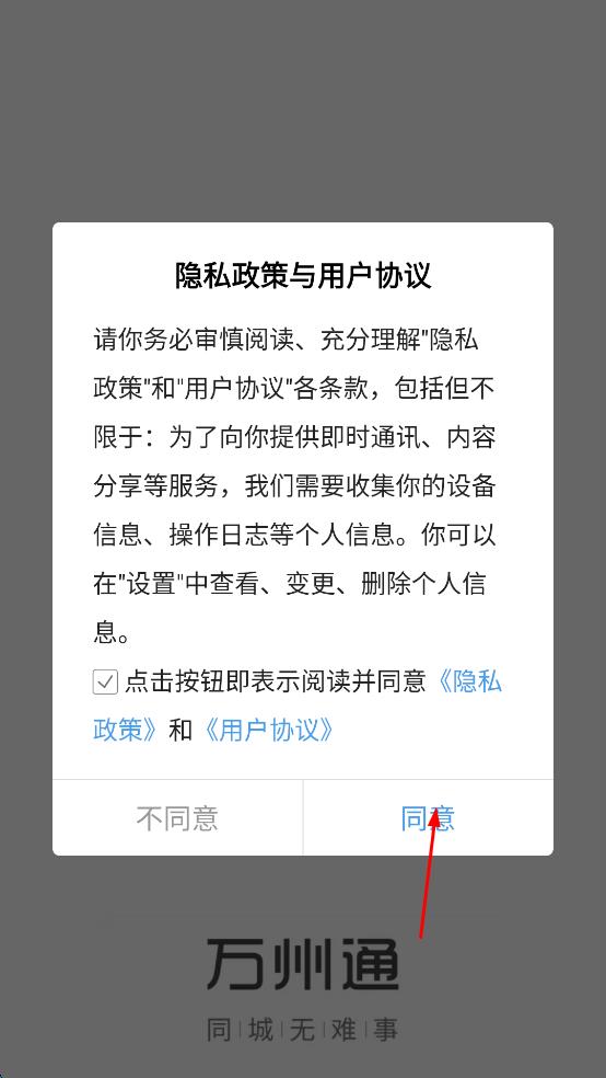 1、打开万州通,在隐私政策与用户协议提示框中,点击“同意”,进入万州通主界面。