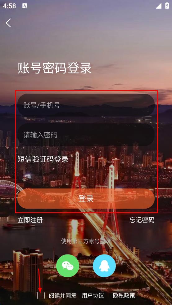 4、在帐号密码登录界面,勾选“阅读并同意用户协议、隐私政策”,输入账号/手机号和密码,点击“登录”即可。