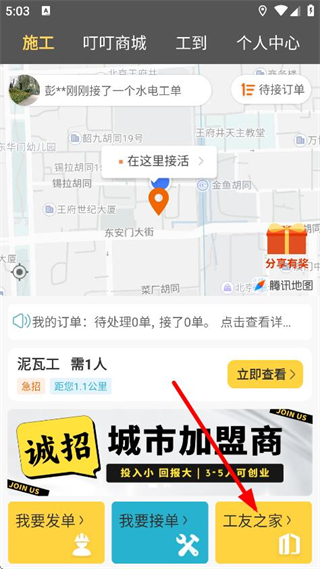 2、在软件主界面,点击工友之家,进入工友之家页面。