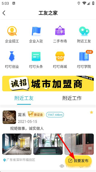 3、在工友之家页面,点击我要发布,进入发布页面。
