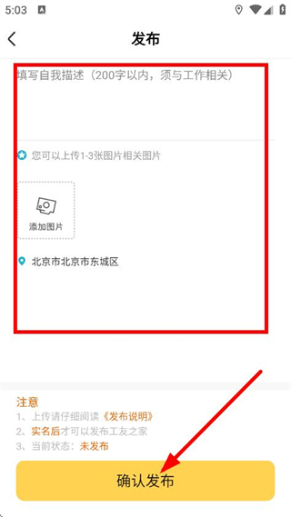 4、在发布页面,填写自我描述、上传相关图片后,点击确认发布,完成发布操作。