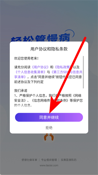 1、打开老来健康App,在弹窗中点击同意并继续。