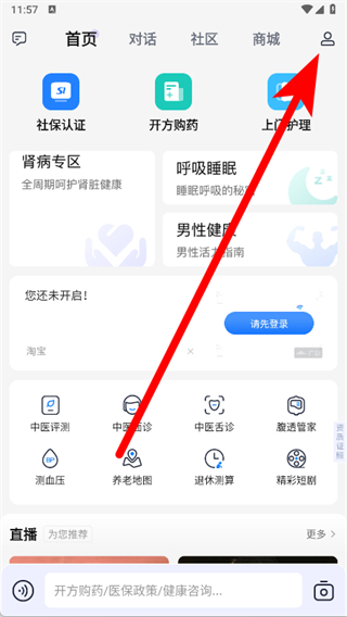 2、进入首页后,点击页面右上角的人物图标。