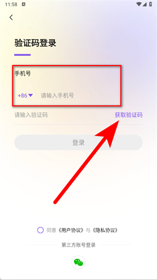 3、在验证码登录页面,输入手机号后点击获取验证码。