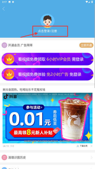 2、在个人中心页面,点击点击登录/注册区域,进入登录/注册界面。