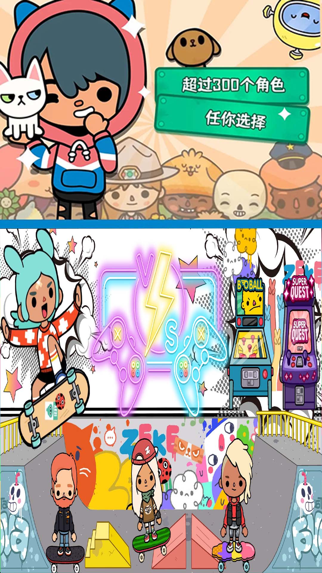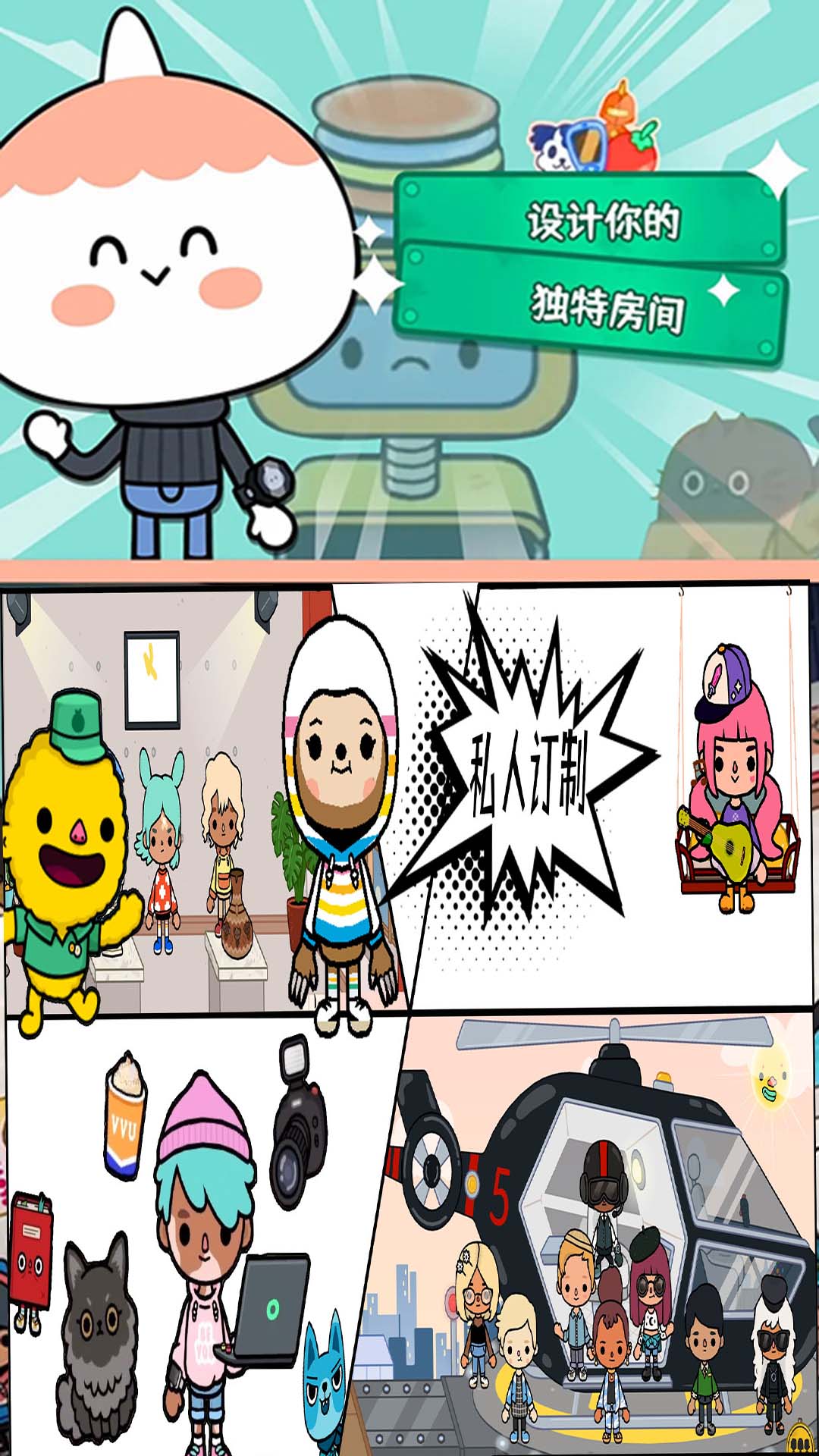 我的家:在这个温馨的场景中,你可以重温童年过家家的乐趣。设计你理想中的家庭成员,安排他们进行各种日常活动:从准备丰盛的早餐,到和兄弟姐妹们一起玩耍,再到洗澡和听睡前故事,每个细节都充满生活气息。购物中心:这座三层的大型购物中心应有尽有,你可以在这里采购新鲜食材,逛宠物店挑选可爱的宠物,在游戏厅畅玩电子游戏,或者和朋友一起观看最新上映的电影。沙龙:想要来个大变身吗?在美发店里,你可以尝试各种时尚发型,从剪发、染发到造型,打造专属于你的个性形象。院:这个神奇的地方配备了变脸机器,让你可以随心所欲地改变外貌。玩累了还可以享受精致的下午茶时光,品尝美味的纸杯蛋糕。时装店:在这里,你可以尽情发挥时尚创意,自由搭配各种服装和配饰,打造百变造型。游戏会定期更新最新款的服饰,让你永远走在潮流尖端。