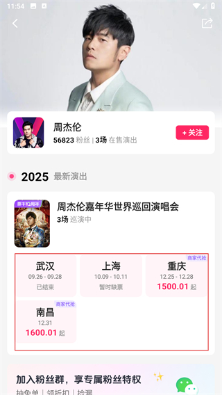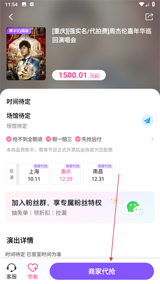 3、在场次的详情页,点击下方商家代抢的按钮,进入选票档的页面。