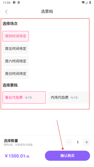 4、在选票档页面,选择演出场次和票档,确认好购买数量后,点击确认购买即可。