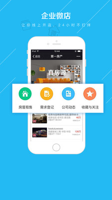 5、企业微店:通过社会化营销打造O2O闭环,帮助中介机构轻松应对互联网冲击,实现线上线下业务无缝衔接,拓展更多盈利渠道和商业机会。