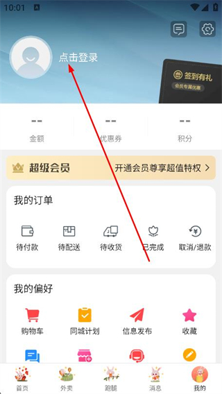 2、在我的页面中,找到并点击上方的点击登录区域。