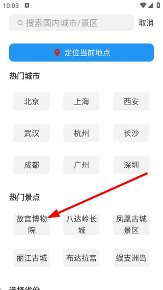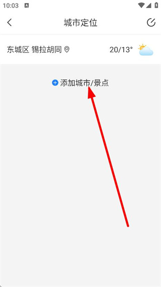 2、在城市定位页面,点击添加城市景点,进入城市景点选择页面。