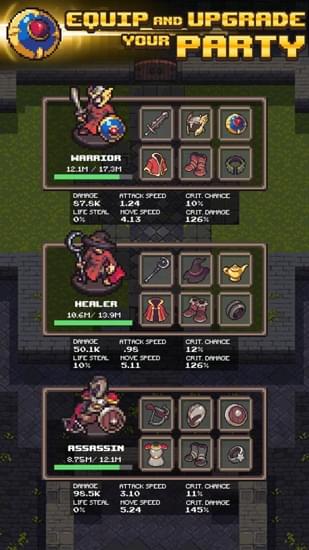 1、进入关卡后游戏会自动反复刷图,战斗效果主要取决于装备品质,技能的作用相对较小。当解锁二转职业时,三个新角色会同时加入队伍。经过属性对比可以发现,圣骑士和死灵法师的基础属性几乎相同,而刺客拥有翻倍的暴击等攻击属性,明显定位为输出角色。玩家需要根据这些特性合理组建队伍。