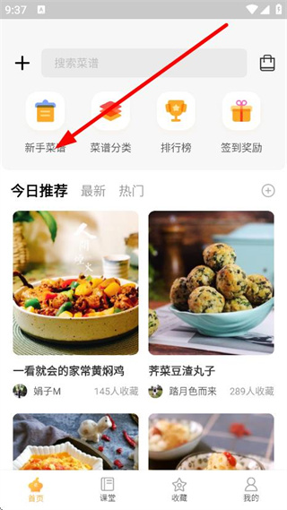 1、在软件首页,点击新手菜谱,进入新手菜谱页面。