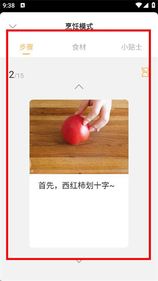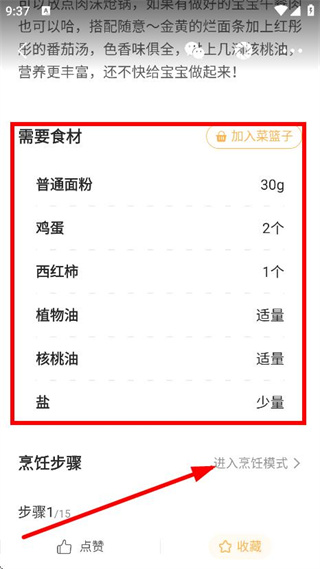3、查看需要的食材后,点击进入烹饪模式,进入烹饪步骤页面。